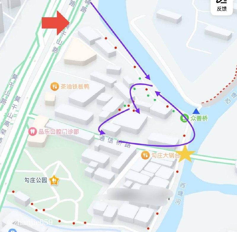 杭州勾庄公园心得及超详细攻略:以通信桥路为中点南北分界 建议从北边入口(红色箭头处)沿着如图路线(紫色箭头)游走 建议多走几次年轻的大致位置如图(绿点分布)lcp(红点分布)通信桥以南(黄色五...